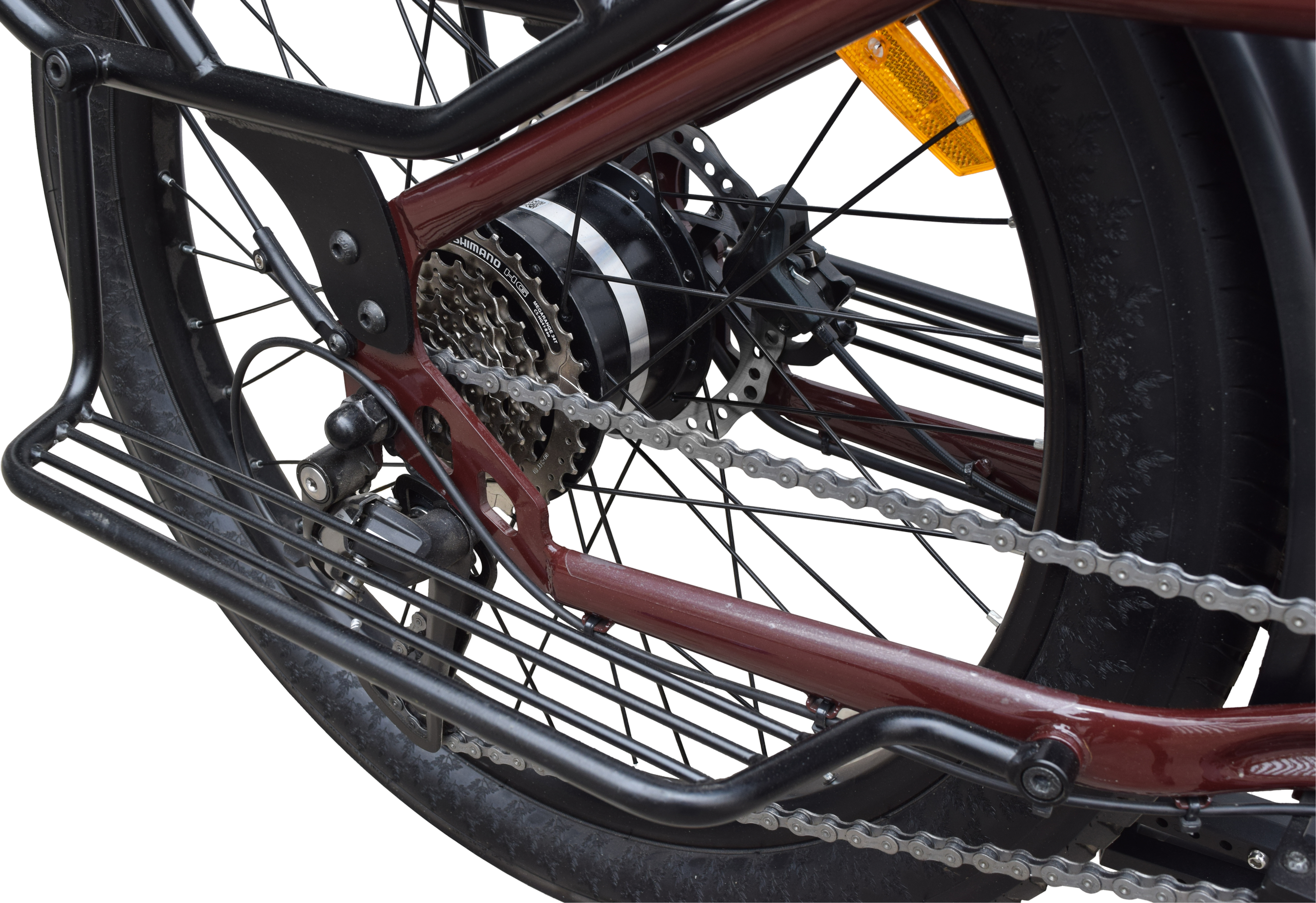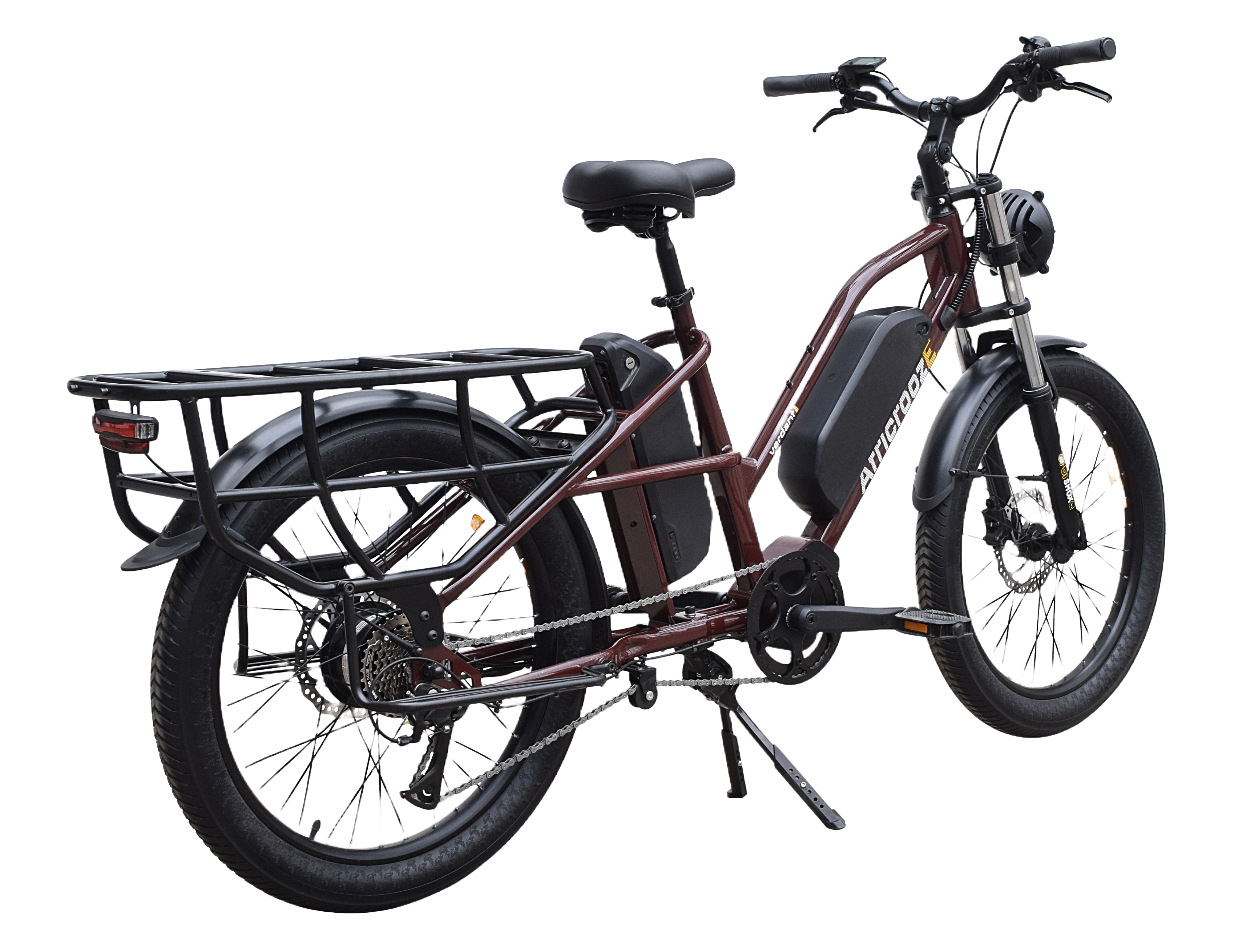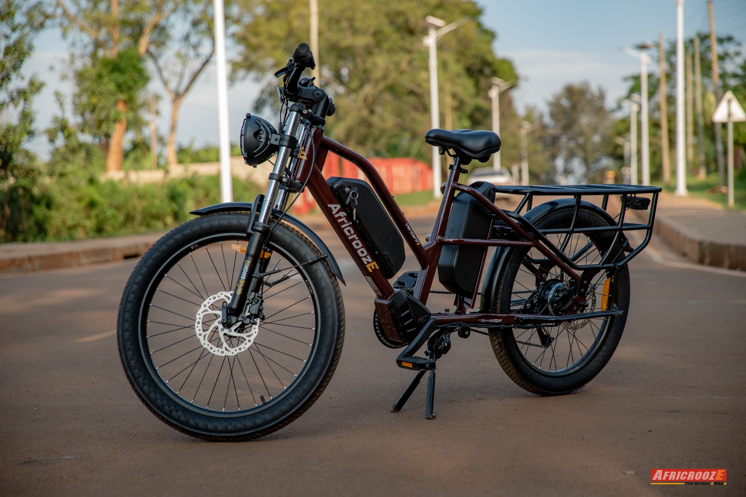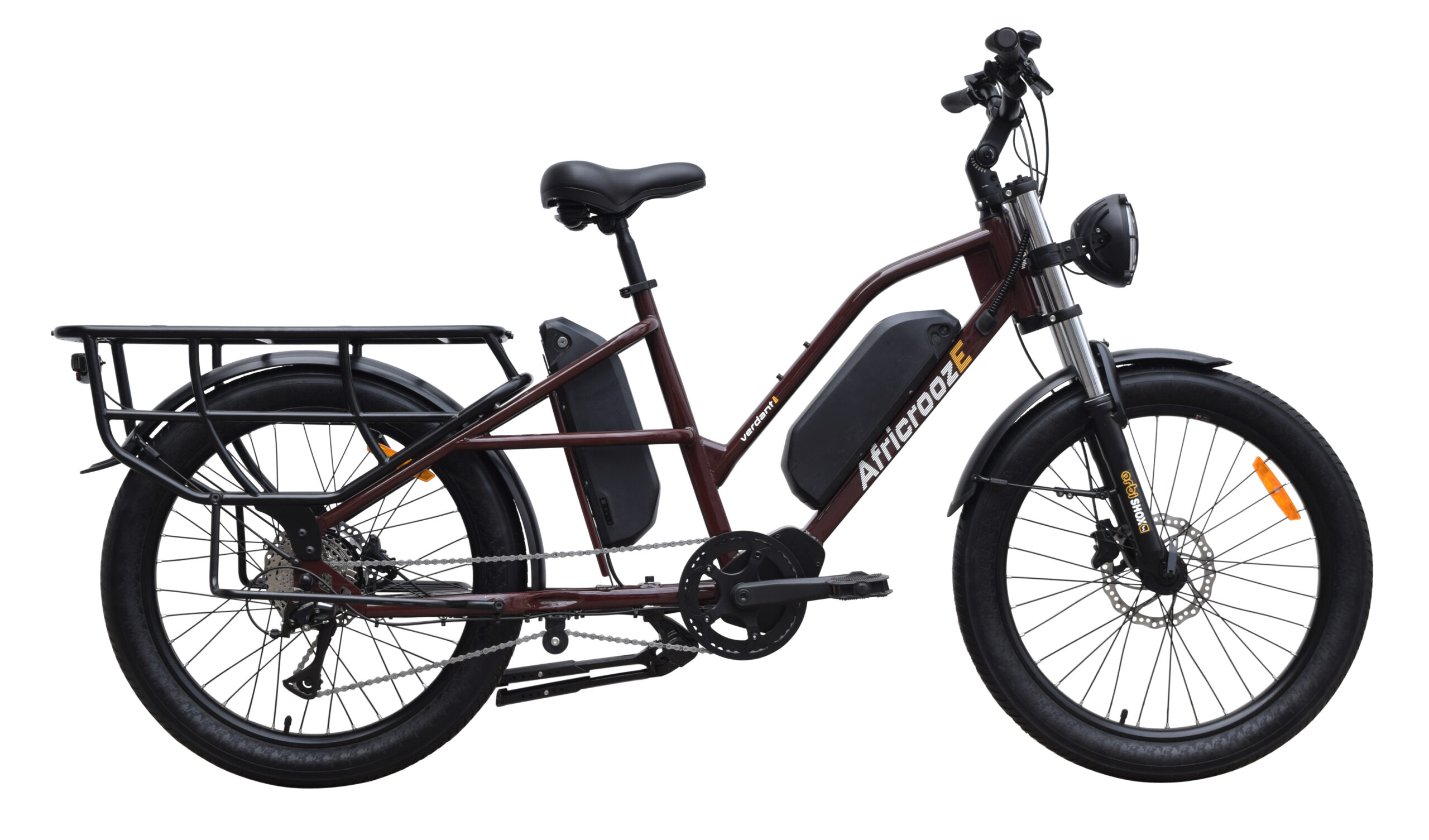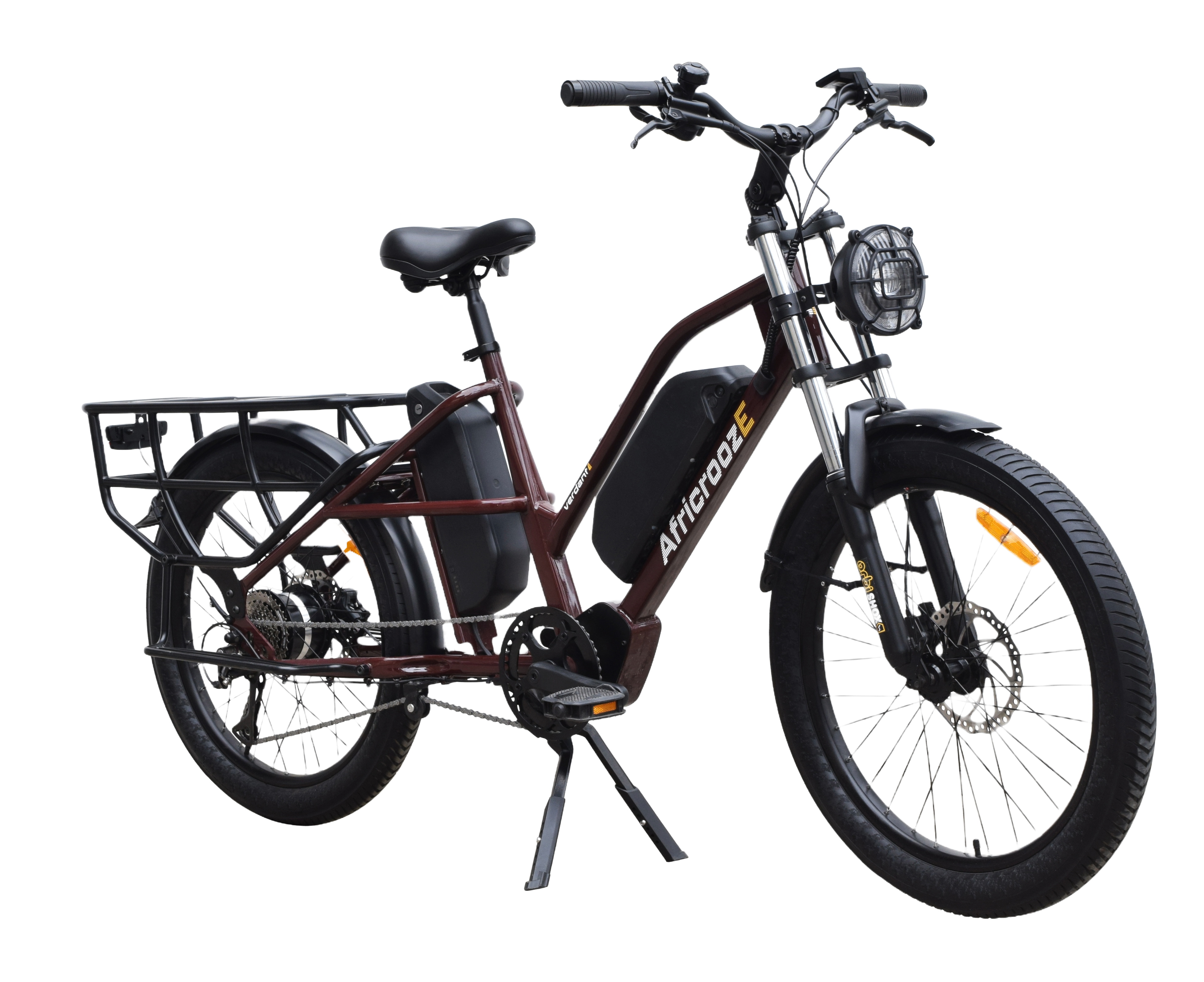 The Allrounder is AfricroozE’s long-tail utility e-bike, built for transporting both people and goods across rough terrains and busy streets. With a strong yet lightweight steel frame and low step-over height, it’s easy to mount and highly maneuverable. Its rear utility rack carries up to 100 kg, making it ideal for delivery riders or small-scale traders. Powered by a 48V 500W Motinova motor and dual battery system (up to 31.8Ah), it achieves 32 km/h speeds and ranges between 60–100 km per charge. Hydraulic disc brakes ensure confident stopping under full loads, while heavy-duty 24×2.4” puncture-resistant tires smooth out rough rides. A double kickstand and front/rear lighting system complete this high-performance workhorse.
